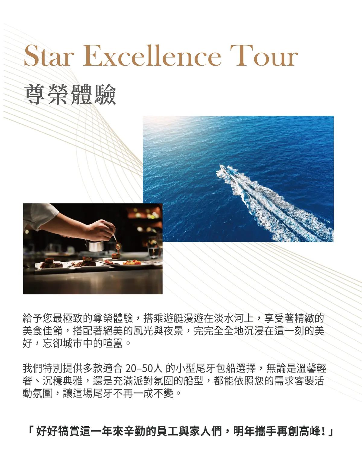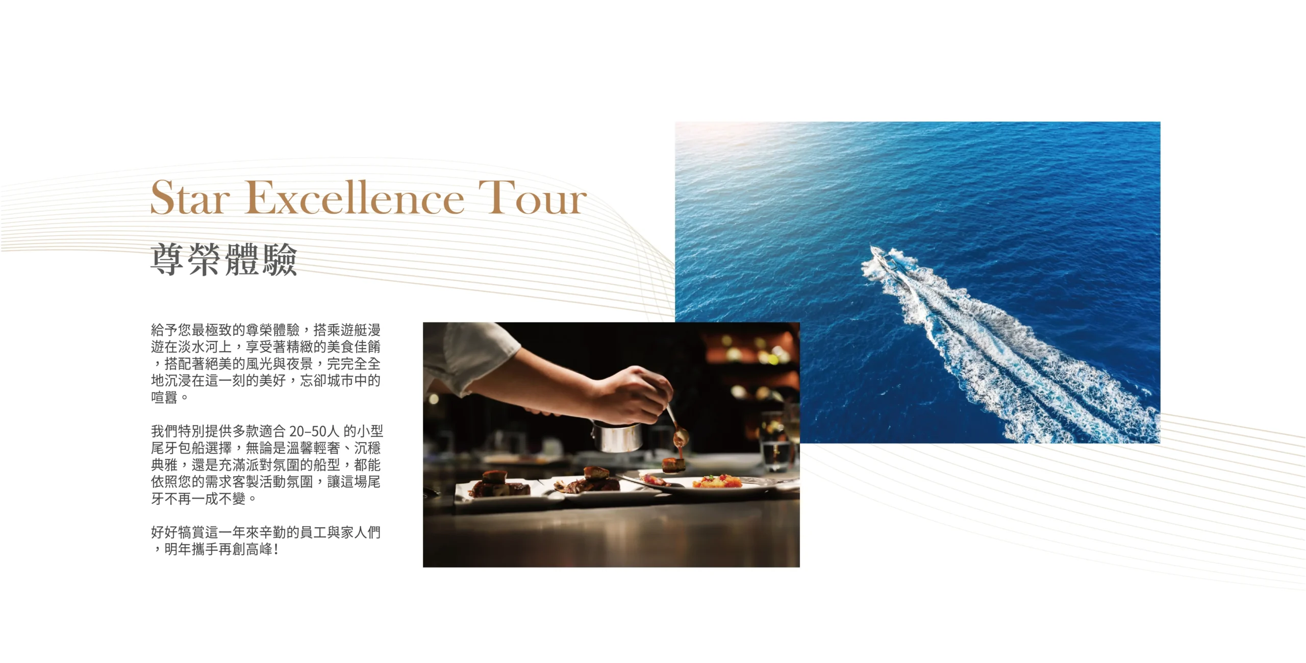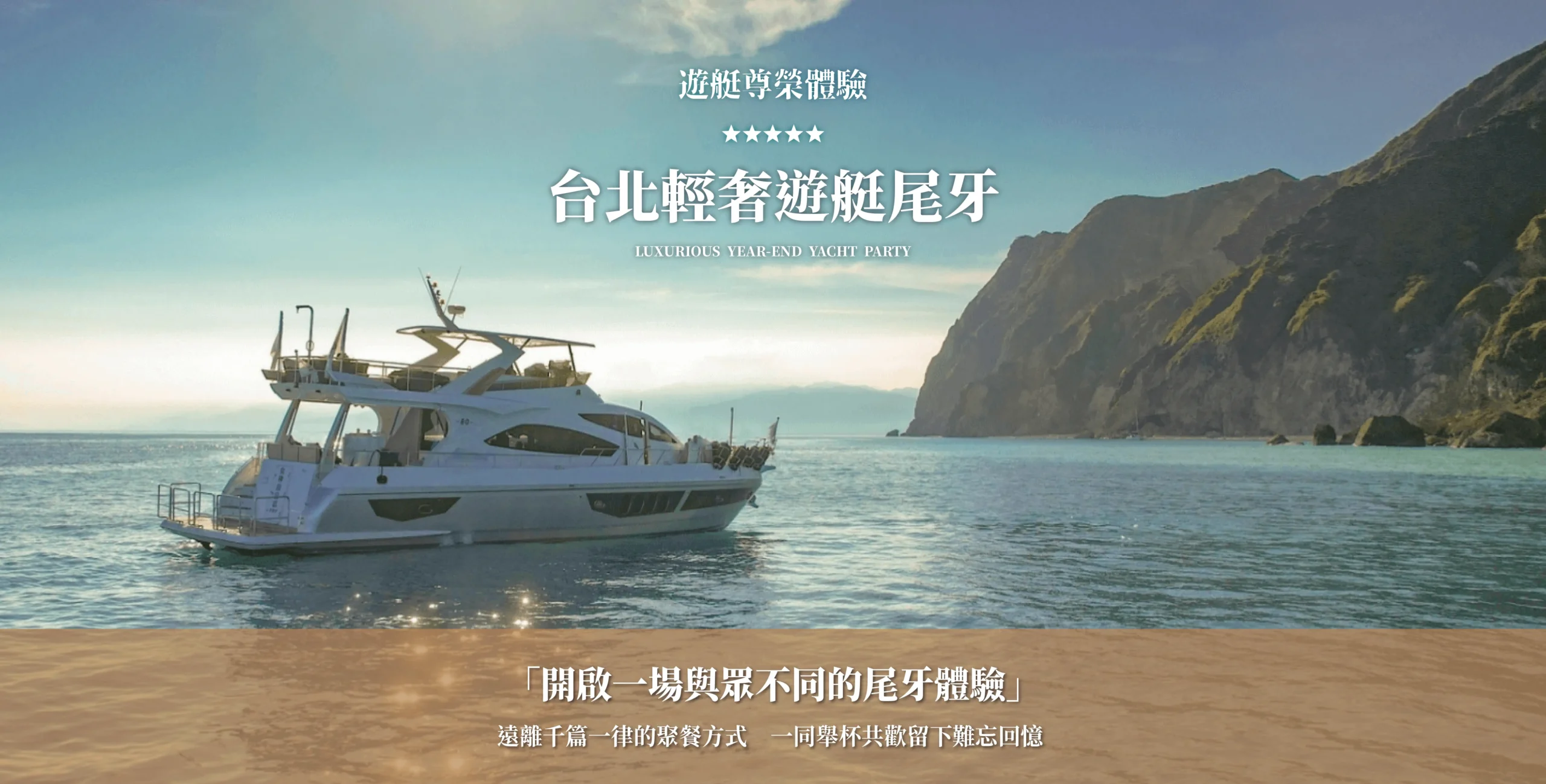 春酒尾牙 Company Banquet 企業會議 Company Meeting 激勵旅遊 Team Building 新品發佈會 Product Launch 台北頂級遊艇 Royal Voyager (可乘載最多30人) 專業調酒師現場調製,提供多款特色酒精飲品,讓賓客盡情暢飲。 狂歡之舞1號 Carnival Dance 1 (可乘載最多42人) 專業調酒師現場調製,提供多款特色酒精飲品,讓賓客盡情暢飲。 狂歡之舞5號 Carnival Dance 5 (可乘載最多20人) 專業攝影師現場拍攝活動過程,捕捉每個精采瞬間。 |KTV導唱系統 含19吋觸碰點歌螢幕,各種歌曲應有盡有,讓活動全場嗨起來! |DJ Live Show 專業 DJ 現場打碟演出,打造熱力四射的派對氛圍,嗨翻全場不中斷! |專業活動佈置 從主題氛圍設計到現場道具搭配,提供全方位客製化布置,讓每場活動都獨一無二。 |專業主持人 經驗豐富的主持人掌握節奏、活絡現場氣氛,確保活動流程順暢又精彩! |動靜態專業攝影師 專業攝影團隊捕捉每個動人時刻,靜態拍照+動態錄影,一次完整紀錄回憶。 |火烤現切牛排 現場火烤、美味現切的牛排饗宴,為活動增添高級餐飲體驗,視覺與味覺雙重享受! |KTV導唱系統 含19吋觸碰點歌螢幕,各種歌曲應有盡有,讓活動全場嗨起來! |DJ Live Show 專業 DJ 現場打碟演出,打造熱力四射的派對氛圍,嗨翻全場不中斷! |專業活動佈置 從主題氛圍設計到現場道具搭配,提供全方位客製化布置,讓每場活動都獨一無二。 |專業主持人 經驗豐富的主持人掌握節奏、活絡現場氣氛,確保活動流程順暢又精彩! |動靜態專業攝影師 專業攝影團隊捕捉每個動人時刻,靜態拍照+動態錄影,一次完整紀錄回憶。 |火烤現切牛排 現場火烤、美味現切的牛排饗宴,為活動增添高級餐飲體驗,視覺與味覺雙重享受! 服務品質 Experiented 負責貼心的服務態度 以及專業可靠的服務經驗 保險保障 Coverage 每位乘客皆有投保 250意外險及30萬醫療險 退款保證 Rest Assured 活動日30天前取消 100%退款保證 多元服務 Multiple Service 煙火秀、專業DJ、Live Band 我們通通幫你實現 顯示更多